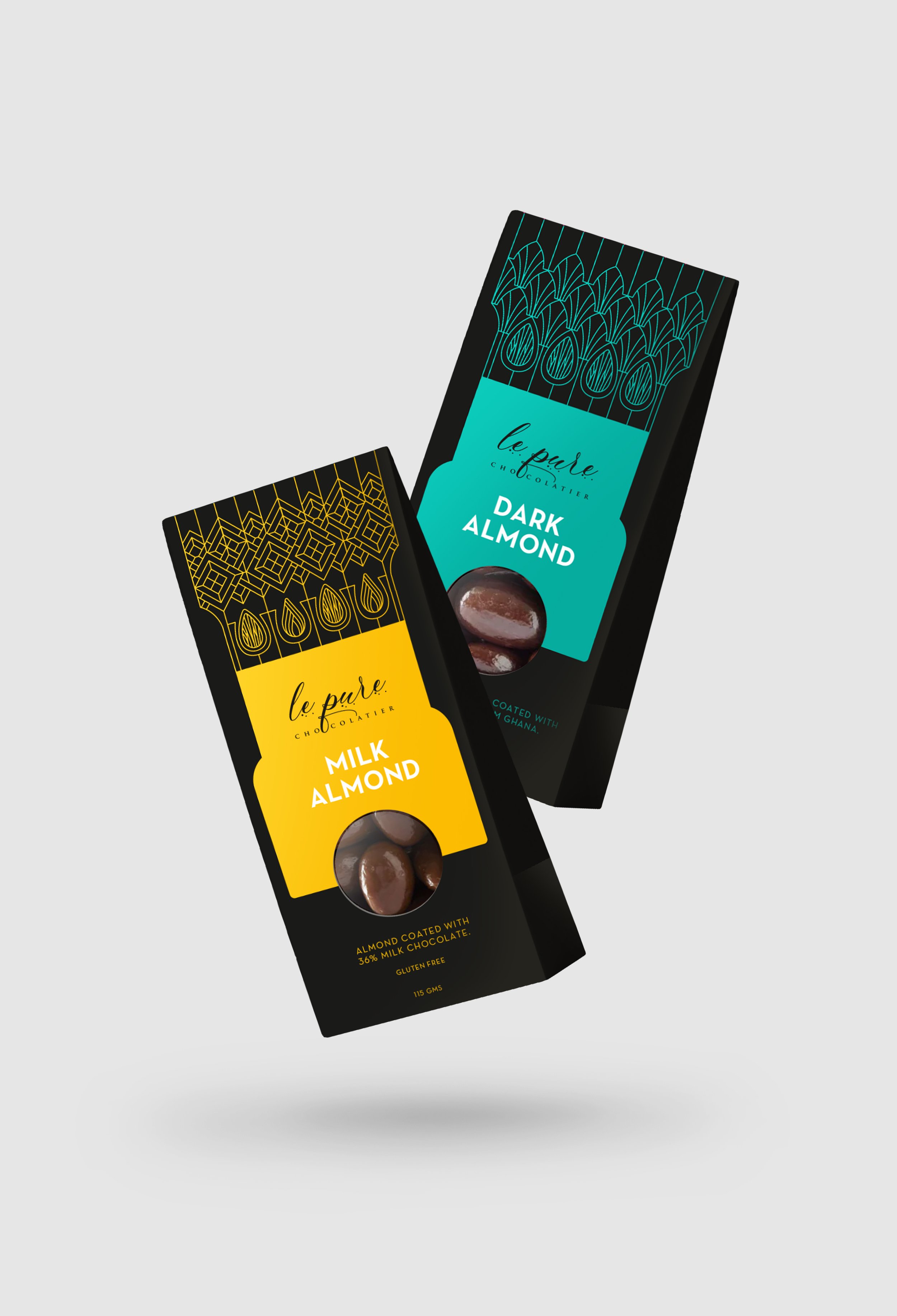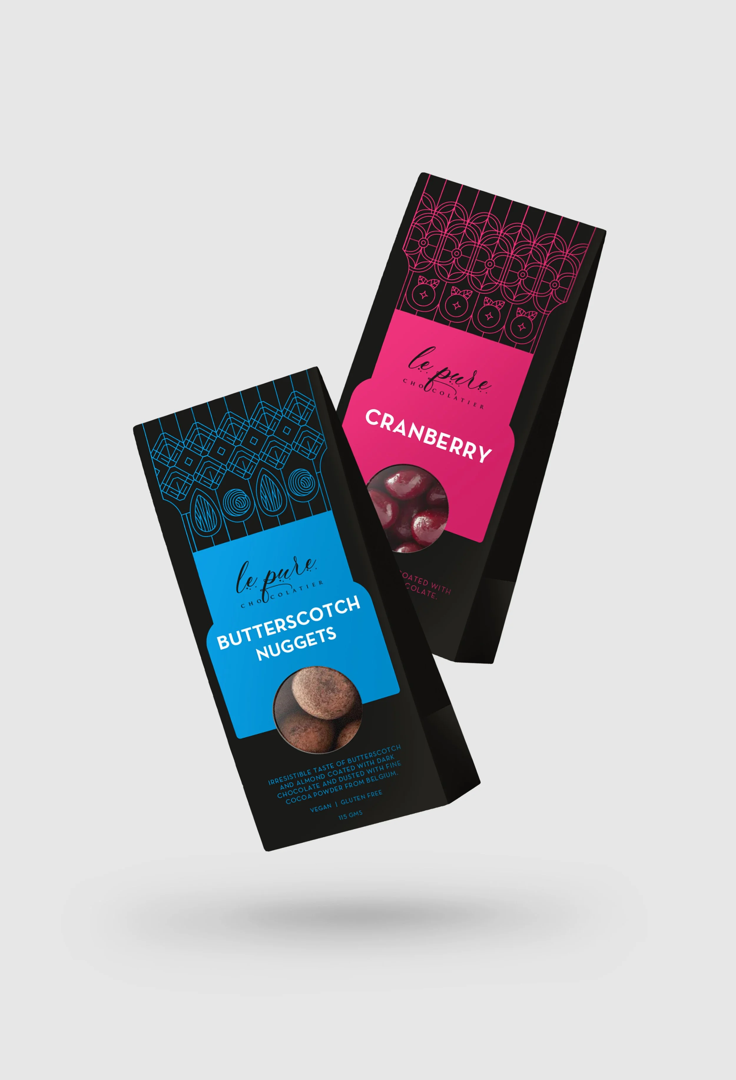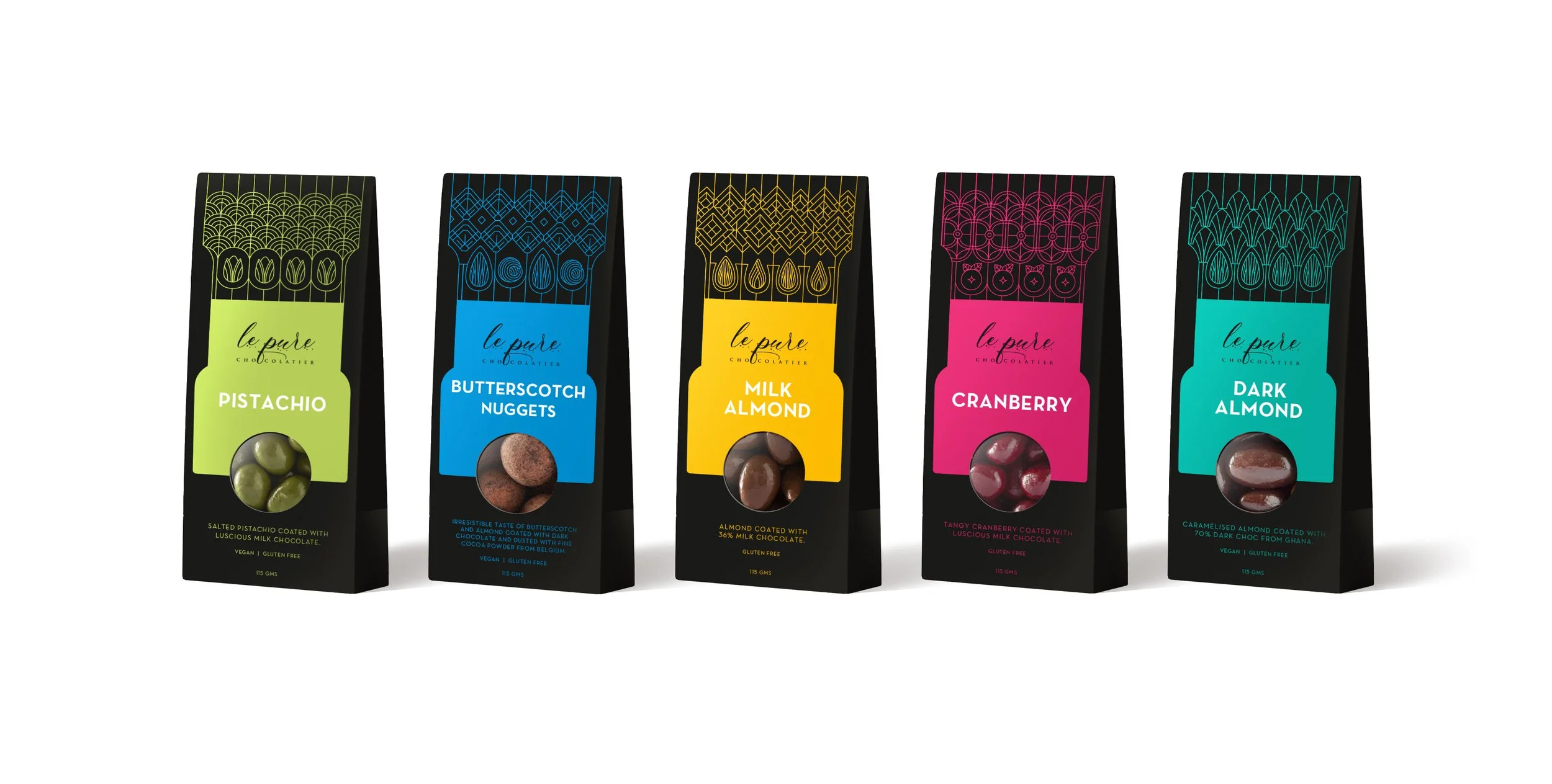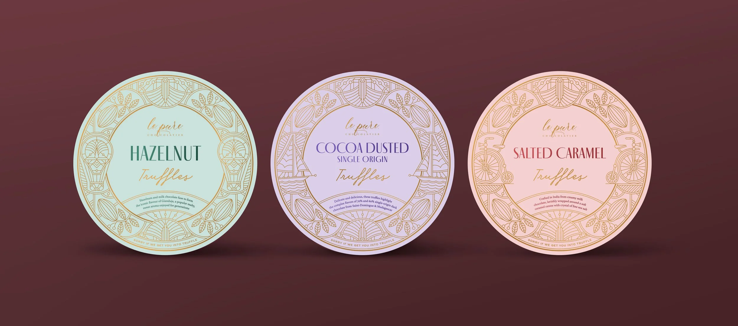 Three variants of shortbread cookies, each individually wrapped in its own pouch are placed within a beautiful and exquisitely designed tin packaging for Le Pure Chocolatier.