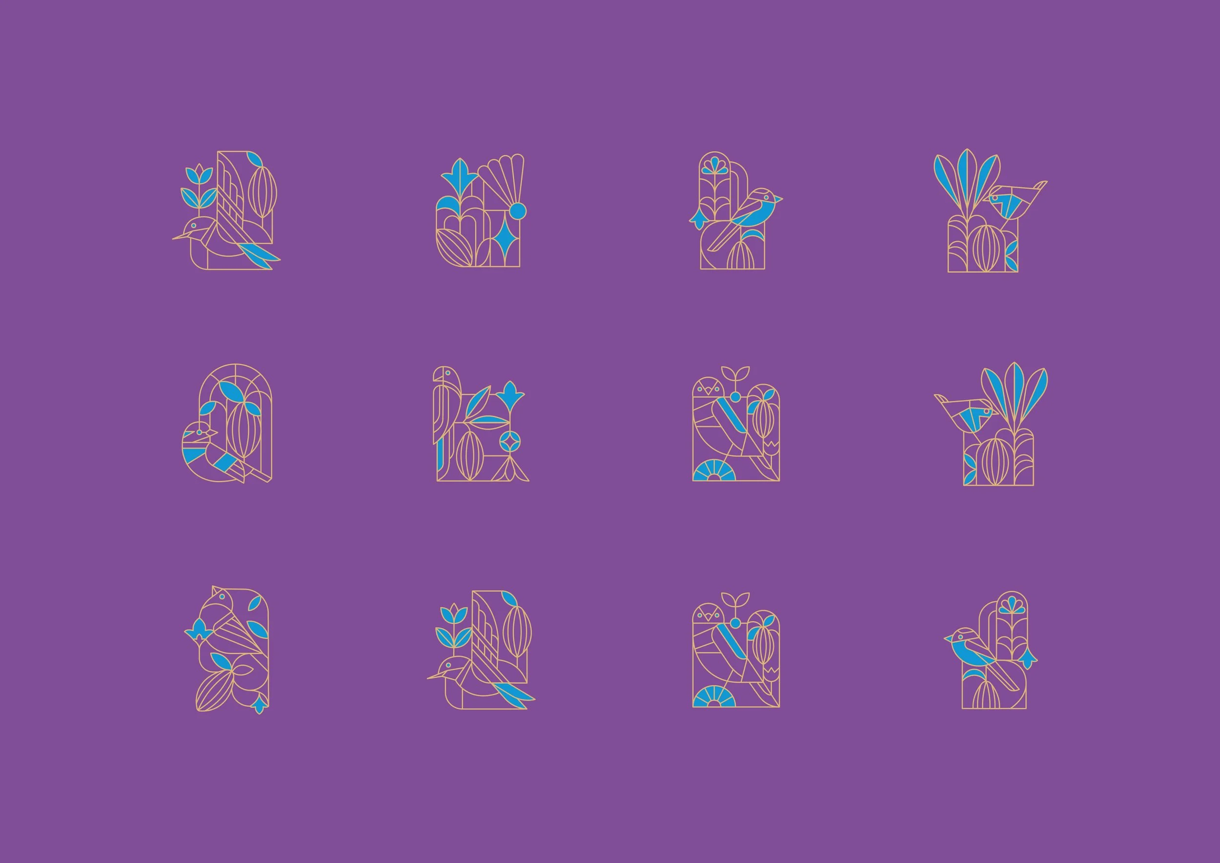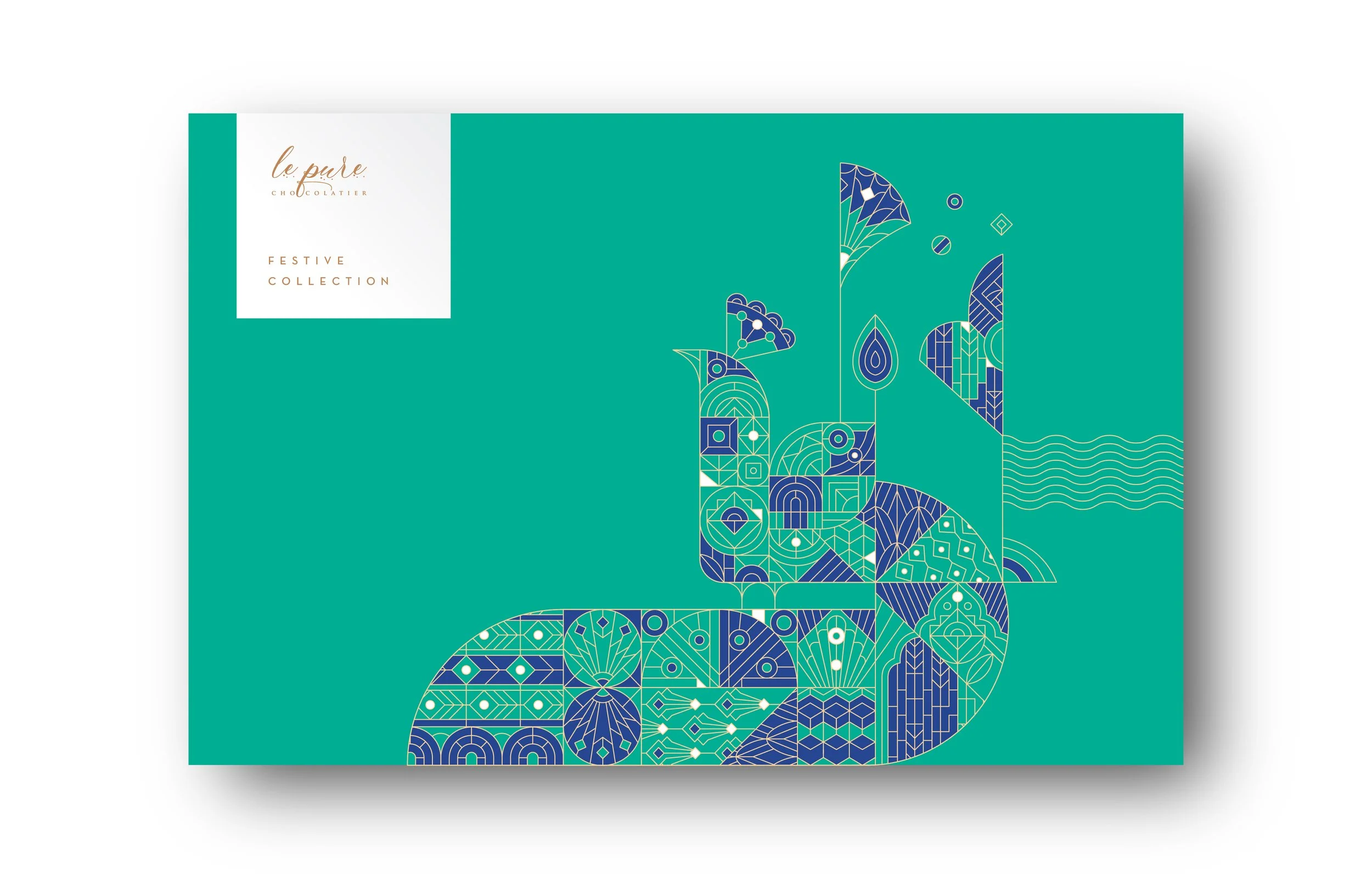 The illustrations of birds nestled among cacao trees adds a natural and fresh touch of life to the packaging design. The design is a combination of delicate gold line work, and art deco type and geometry.